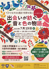 今回は、第3回「さまざまな視点で世界を見る」ハンガリー編~出会いが紡ぐ音と色の物語~についてご案内いたします。多様な分野で活躍するハンガリー語専攻の卒業生や、ハンガリー出身のクラリネット奏者などさまざまな形でハンガリーに関わる人々の語りに触れて、新たな視点を得てみませんか?