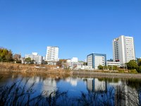 ▲写真中央=西門の横断歩道を渡ったすぐ先の水遠池からは、工学研究科U1E棟の高い建物がよく見えます。
