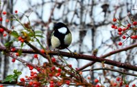 ▲写真左=テクノアライアンス棟前の赤い木の実を食べに来たシジュウカラ。