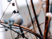 ▲写真右=白い木の実をついばみにやって来たエナガ。「ジュリリ」という濁った声で、素早く動きます。