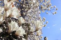 ▲写真右=医学部附属病院の外観をやわらかく照らすように、モクレンが咲いています。