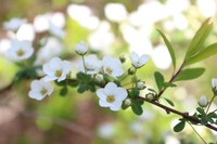 ▲写真左=春になると細い枝いっぱいにたくさんの白い花を咲かせるユキヤナギ。その姿が柳の枝に降り積もった雪のように見えることから名づけられました。