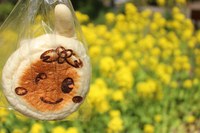 ▲写真右=菜の花を前に、思わず笑顔がこぼれるアンパン姿の「すいたん」(吹田市のイメージキャラクター)。
