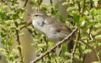 ▲写真左=喉をいっぱいに膨らませ、「ホーホケキョ」とさえずるウグイス。