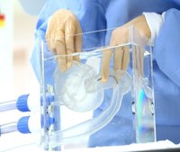 写真左:本発明による心臓カテーテルシミュレーター 写真右:心臓カテーテルシミュレーターを用いたX線透視下での手術画像