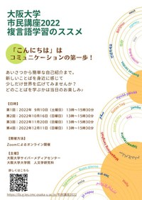 ◆ 大阪大学市民講座2022 複言語学習のススメ(10/16、11/20、12/11) 「こんにちは」はコミュニケーションの第一歩!世界のいろんなことばで「こんにちは」って言ってみませんか?この講座では新しい言葉を身近に感じて、挨拶から簡単な自己紹介ができるよう学んでいきます。どのことばを学ぶかは当日のお楽しみ!皆様のご参加をお待ちしております。 〇開催日時:10月16日(日)13:00~15:30 11月20日(日)13:00~15:30 12月11日(日)13:00~15:30 〇開催方法:Zoomによるオンライン開催 〇学ぶことば:ロシア語、ヒンディー語、トルコ語、インドネシア語など 〇申込方法:こちらから事前にお申込みください。 ⇒詳細はこちら