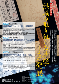 ◆ 第15回適塾講座「「洪庵の取り組んだ薬学:その発展」(9/29、10/27、11/24) 大阪大学の精神的源流は、緒方洪庵の作った適塾に求めることができます。適塾を開いた緒方洪庵は、天然痘に対する種痘事業やコレラ対策など、先進的な取り組みにより、医学・薬学的に大きな功績を残しました。今回の適塾講座では、緒方洪庵の様々な取り組みの発展、現在の最先端の研究の一端をご紹介いたします。 ○日時:9月29日(木)、10月27日(木)、11月24日(木) 各回18:30~20:00 ○会場:光世証券株式会社 本社ビル11階GTホール(大阪市中央区北浜二丁目1番10号) ○定員:各回35名(申込先着順) ⇒詳細・お申込みはこちら ※9月29日の講座については、申込期限が9月26日(月)となります。