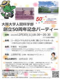 ★人間科学部50周年記念パーティー(12/3)のご案内★ 人間科学部創立50周年を記念して、同窓会と学部共催のパーティーを開催します。同期、同講座など久しぶりに集合するいい機会かと存じますので、お誘いあわせの上奮ってご参加くださいますようご案内申し上げます。 〇日時:12月3日(土)18:30 開宴(17:30受付開始、18:00開場) 〇会場:リーガロイヤルホテル(大阪) 3F ロイヤルホール(大阪府大阪市北区中之島5丁目3-68) 〇会費:12,000円 (現役学部生10,000円)※感染症対策費用を含む 〇申込締切:10月31日(月) ⇒申込方法等の詳細はこちら ↑画像からチラシPDFにリンクします