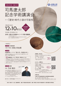 ◆ 令和4年度司馬遼太郎記念学術講演会「歴史・時代小説の可能性」(12/10) 大阪外国語大学出身の作家:司馬遼太郎氏の業績を偲ぶ「司馬遼太郎記念学術講演会」を開催いたします。今年はテーマを「歴史・時代小説の可能性」として、作家の今村翔吾さんの講演や本学学生による短編映像コンテストを開催します。ぜひご参加ください! 〇日時:12月10日(土)13:00~15:00 〇会場:大阪大学箕面キャンパス1階大講義室 ※オンライン視聴あり(ライブ配信、アーカイブ配信) 〇申込方法:以下から事前にお申込みください。 ①会場参加申込フォーム【申込締切:11/24(木)】 ②ライブ視聴・アーカイブ配信視聴申込フォーム【申込締切:ライブ配信…12/7(水)、アーカイブ配信…公開終了前日】 〇定員:①会場参加 115名 ②ライブ配信 450名・アーカイブ配信 定員なし 〇参加費:無料 ⇒詳細はこちら