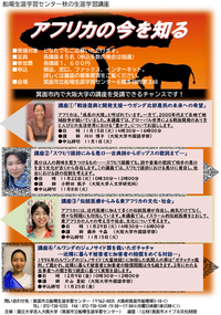 ◆ 令和4年度秋の生涯学習講座「アフリカの今を知る」(11/15、22、29、12/9) アフリカは広大で、50以上の国・地域が存在し、約13億人が暮らしています。そこにはそれぞれの文化や社会が形成されていますが、日本のメディアで取り上げられる機会はそんなに多くありません。 アフリカ研究を進める本学の教員が、今のアフリカの姿を各視点からお話しします。この機会にアフリカを身近に感じてみませんか? 〇開講日:11月15日(火)、22日(火)、29日(火)、12月9日(金)各90分 〇会場:箕面市立船場生涯学習センター(箕面市船場東3丁目10-1) 〇定員:各講座45名 ※お申込み者が多数の場合は抽選により受講者を決定いたします。 〇申込方法・締切:こちらのページの「受講料・お申込み」から事前にお申込みください。 ※講座によって申込締切が異なりますので、上記ページをご確認ください。 〇受講料:各講座1,600円 ⇒講座内容等の詳細はこちら