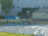 ▲11月4日からの「まちかね祭」に向けて、豊中キャンパスでは早くも9月26日にステージの建設。「こんなに早く?」と驚いていたら、本番に向けて建て壊しの練習をしていたのでした。意気込みが伝わりますね。