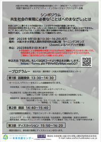 ◆ IMPACT シンポジウム共生社会の実現に必要な「ことばへのまなざし」とは(9/1) 本シンポジウムでは、ことばと対話に関する経験を共有するとともに、それらを様々な角度から捉え、ことばと共生の問題について議論を行います。 【日 程】9月1日(金)13時30分~16時20分 【開催形式】ハイブリット開催(人間科学研究科北館2階 ラーニングコモンズ・Zoom) 【申込方法】申込フォームより8/31までにお申し込みください。 ⇒詳細はこちら