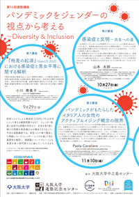 ◆ 第16回 適塾講座「パンデミックをジェンダーの視点から考える ~Diversity&Inclusion」(9/29,10/27,11/10) 新型コロナウィルス感染症(COVID-19)は女性にとって単なる健康問題ではなく、ジェンダー格差に起因する問題の存在など、女性を取り巻く様々な問題を再認識させる機会となりました。今回の適塾講座では、新型コロナ禍で露呈した問題についてジェンダー・レンズを通して見る重要性を確認し、諸課題についてグローバルな背景を持つ専門家たちに論じていただきます。 〇日時:9月29日、10月27日、11月10日 各回18:30~20:00 ○会場:大阪大学中之島センター 7階セミナー室(大阪市北区中之島4-3-53) ○定員:各回50名(申込先着順) ⇒詳細・お申込みはこちら