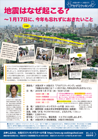 ◆ 大阪大学×大阪ガス アカデミクッキングvol.65「地震はなぜ起こる? 〜1月17日に、今年も忘れずにおきたいこと」(1月17日) どうして日本では大地震が頻発するのでしょうか? この問いに答えるために、まずは地球の中がどうなっているのかを理解しましょう。46 億年前の誕生から今日までも、地球はずっと生き続けているのです。今回の講義では、地震発生のメカニズムの簡単な説明に加え、これから発生を控えている東海・東南海・南海地震について、我々はどこまで理解できているのかを解説し、その防災対策についてお話しします。 ○日時:2018年1月17日(水)18:30〜21:00 ○会場:大阪ガスクッキングスクール千里 ○受講料:2,500円 ○講師:廣野哲朗(大阪大学大学院理学研究科・准教授) ※申し込み多数の場合は抽選(申込受付中:~12月19日(火)23:59まで) ⇒詳細・お申込みはこちら