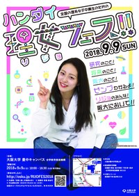 ◆ ハンダイ理女フェス!!(9月9日) ~大阪大学に「未来の自分」を探しにきませんか?~ 全国の理系女子中高生のための『ハンダイ理女フェス!!』を開催します! 理系をめざすアナタ、進路を迷っているアナタ、皆さんを応援する先輩が待っています。大阪大学の理系女子や女性教員、企業で働く女子社員の生の声を聞いて、アナタの個性が輝く未来を一緒に探しましょう。 ○日時:9月9日(日)10:00~ ○場所:大阪大学豊中キャンパス 全学教育推進機構 ⇒詳細・お申込みはこちら