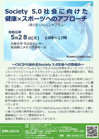 ◆ サイバースポーツコンプレックス(CSC)シンポジウム(5月28日) 「Society5.0社会に向けた 健康×スポーツへのアプローチ」~CSCから始めるSociety 5.0社会への取り組み~ 大阪大学では、「サイバースポーツコンプレックス構想(Cyber Sports Complex:CSC構想)」を立案し、スポーツ・ヘルスケアに関連する様々な教育研究活動、産学連携による社会実装の推進、次世代型グラウンドへの発展など、社会課題を総合的に捉え、新たな社会的価値・収益事業価値を持つための取組みを始めています。 本シンポジウムでは「CSCから始めるSociety5.0社会への取組み」と題して様々な分野の専門家をお招きし、Society5.0社会の実現に向けた新たな価値創出についてご講演頂きます。 皆様のご来場を心よりお待ちしております。 ○日時:5月28日(火)14:00〜17:00 ○会場:大阪大学中之島センター 佐治敬三メモリアルホール ○参加費:無料 ○定員:先着 160名 ※定員に達し次第、申し込みを締め切らせて頂きます。 ⇒詳細・お申込みはこちら