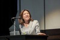 【2】イベントリポート ◆ 第14回大阪大学ホームカミングデイを開催しました 5月3日(金)、第14回ホームカミングデイを開催し、多くの卒業生、在学生、保護者、教職員など「大阪大学ファミリー」が一堂に集まりました。 セレモニー・講演会では、会議通訳者として各国要人の通訳としてご活躍のランプキン朋子さん(1974年大阪外国語大学卒業)から「異文化間コミュニケーションー英語を超えて」と題した講演があり、まずはホワイトハウスでのステートディナーの話などで笑いを誘い、欧州と米国での通訳現場の違い、通訳におけるAIの可能性、日本の英語教育への提案など分かりやすい例を用いて話され、参加者は興味深く聴き入りました。 交流会は、久しぶりの再会、新たな出会いにあたたかくも賑やかな歓談の輪が広がりました。 ⇒詳細はこちら
