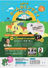 【4】同窓会トピックス ◆ 大阪大学ホームカミングデイを開催!!(5月2日(土)) 大阪大学・大阪外国語大学の卒業生、教職員OB・OGをはじめとした皆さまを、年に一度キャンパスにお迎えし、阪大ファミリー同士の交流を深める「大阪大学ホームカミングデイ」を今年も開催します。 今年は、大阪市天王寺動物園長の牧慎一郎さん(基礎工学研究科修了)にご講演いただきます!! ○日時:5月2日(土)10:00~13:00 ○会場:大阪大学豊中キャンパス ⇒詳細・お申込みはこちら
